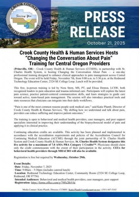Crook County Health & Human Services, in partnership with St. Charles Health System, is hosting Changing the Conversation About Pain—a free, one-day training for healthcare professionals on Friday, November 7th, from 9:00 a.m. to 5:30 p.m. at the Redmond Technology Education Center. Led by pain education experts Nora Stern, MS, PT, and Elissa Denton, LCSW, the training will cover updated pain science, trauma-informed care, and practical tools for team-based, patient-centered pain management. Open to medical and behavioral health providers, case managers, and peer support specialists, the event offers continuing education credits and includes lunch. Registration is free but required by Wednesday, October 29.