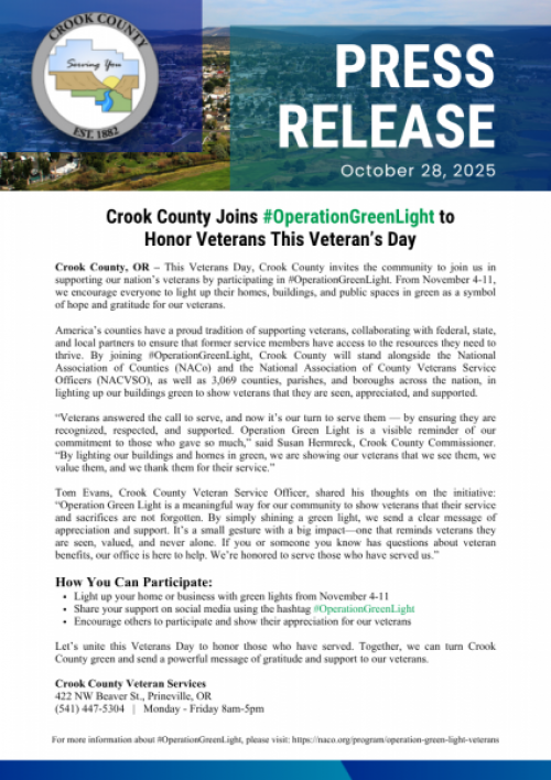 Press Release: Crook County Joins #OperationGreenLight to Honor Veterans This Veteran’s Day